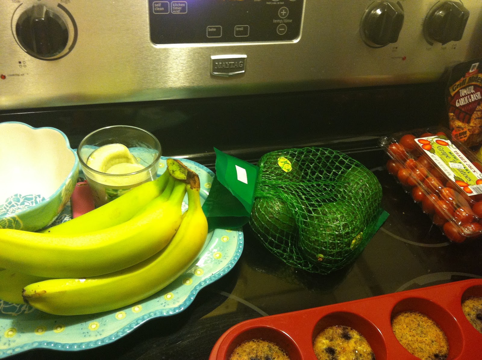 Here's my breakfast one morning: Lemon muffin, awesome trader joes sausage, banana, and tomatoes